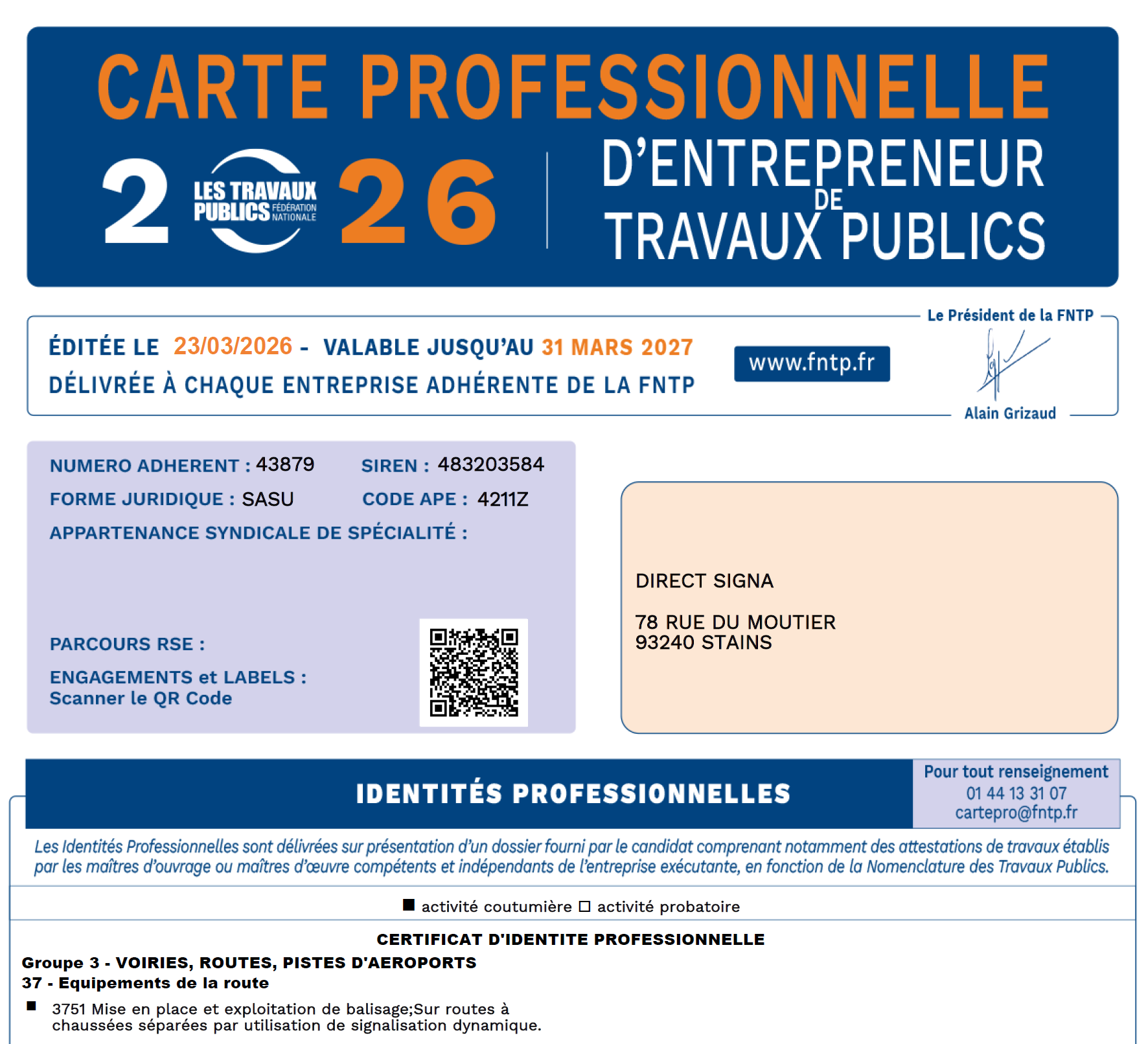 DIRECT SIGNA est adhérent à la FNTP et au Syndicat des Équipements de la Route dans la section balisage signalisation temporaire depuis 2016.