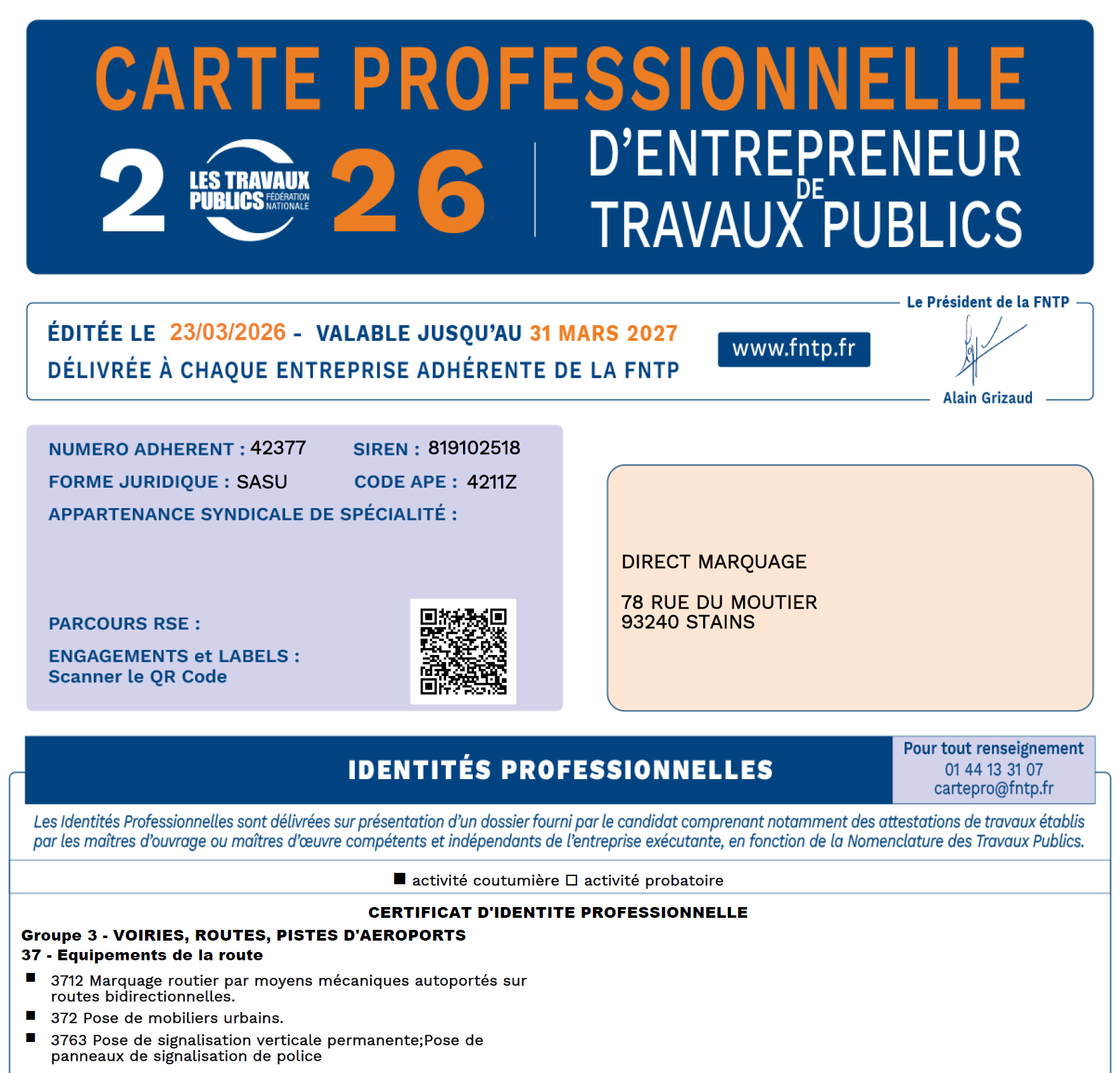 DIRECT MARQUAGE est adhérent à la FNTP et au Syndicat des Équipements de la Route dans la section signalisation horizontale depuis 2016.